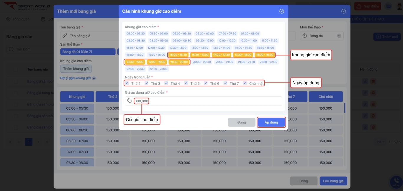 - Click chọn các khung giờ cao điểm sau đó nhập giá và "Áp dụng".