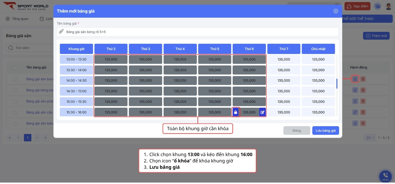 Bạn muốn thay đổi giá của khung giờ từ 13:00 - 16:00 ngày thứ 2 - thứ 6 thì click vào "13:00" kéo đến "16:00" từ "Thứ 2" đến "Thứ 6" sau đó nhấn icon "bút sửa", nhập "Giá muốn sửa" và "Áp dụng"