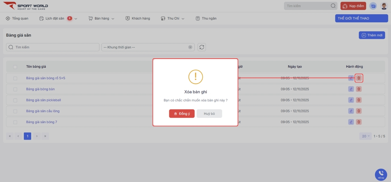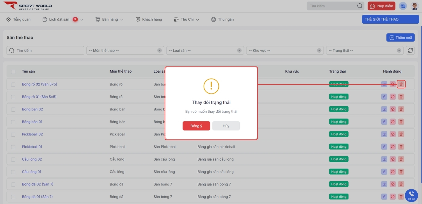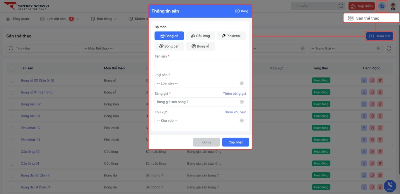 - Sân thể thao: Thêm, sửa, xóa sân; gán bảng giá, chọn khu vực, xác định môn thể thao và trạng thái hoạt động.