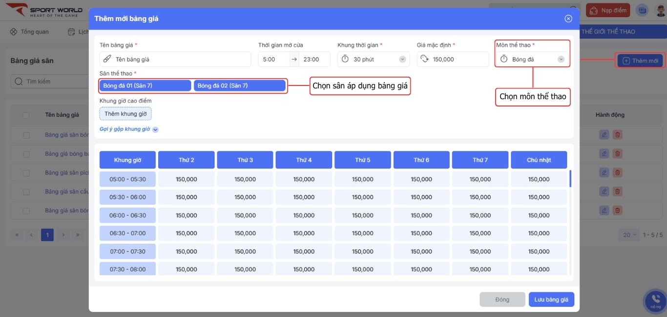 - Bảng giá: Thiết lập và quản lý bảng giá thuê sân theo thời gian, ngày trong tuần hoặc giờ cao điểm.