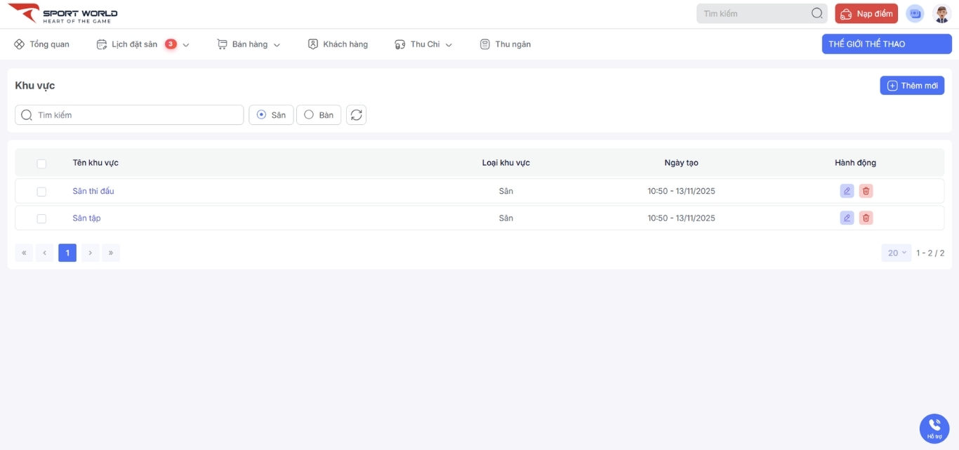 - Khu vực: Phân nhóm các sân theo khu vực (sân tập, thi đấu,...) trong cùng một chi nhánh