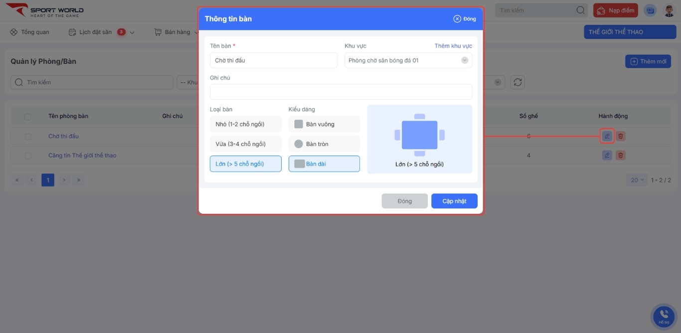 - Nhấn icon "hình bút" để chỉnh sửa thông tin tên bàn/phòng, khu vực, ghi chú, loại bàn, kiểu dáng.