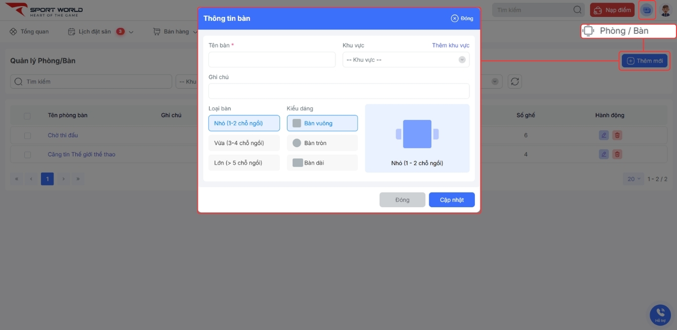 - Nhập: tên bàn/phòng, khu vực, ghi chú, loại bàn, kiểu dáng