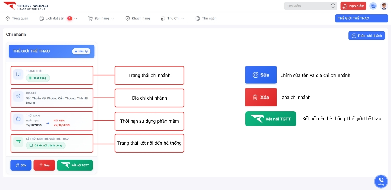 - Quản lý chi nhánh: Dùng để tạo và quản lý các cơ sở hoặc chi nhánh sân thể thao khác nhau.