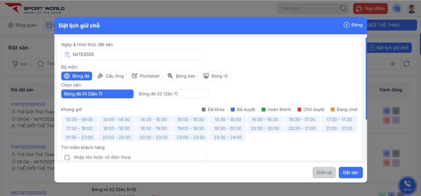 - Tìm kiếm nhanh: Nhập số điện thoại, tên khách hàng hoặc mã đặt sân.