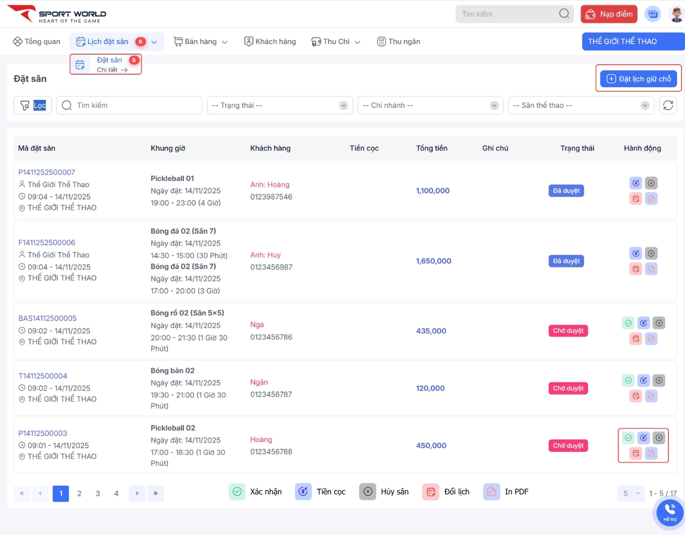 Ở cột "Hành động" ở mỗi dòng trong danh sách đơn đặt sân, phần mềm cho phép bạn: Xác nhận/ Nhập tiền cọc/ Hủy/ Đổi lịch/ Tải PDF yêu cầu đặt sân.