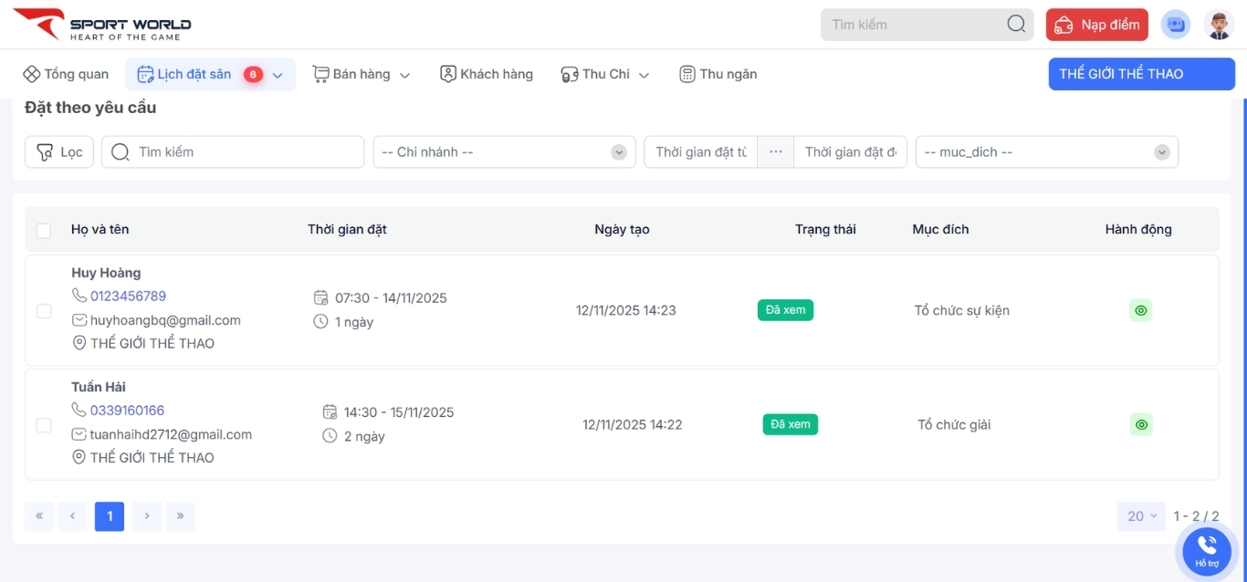 Hiển thị toàn bộ các phiếu đặt sân theo danh sách, giúp chủ sân và nhân viên dễ dàng theo dõi, lọc và thao tác với từng yêu cầu đặt sân.