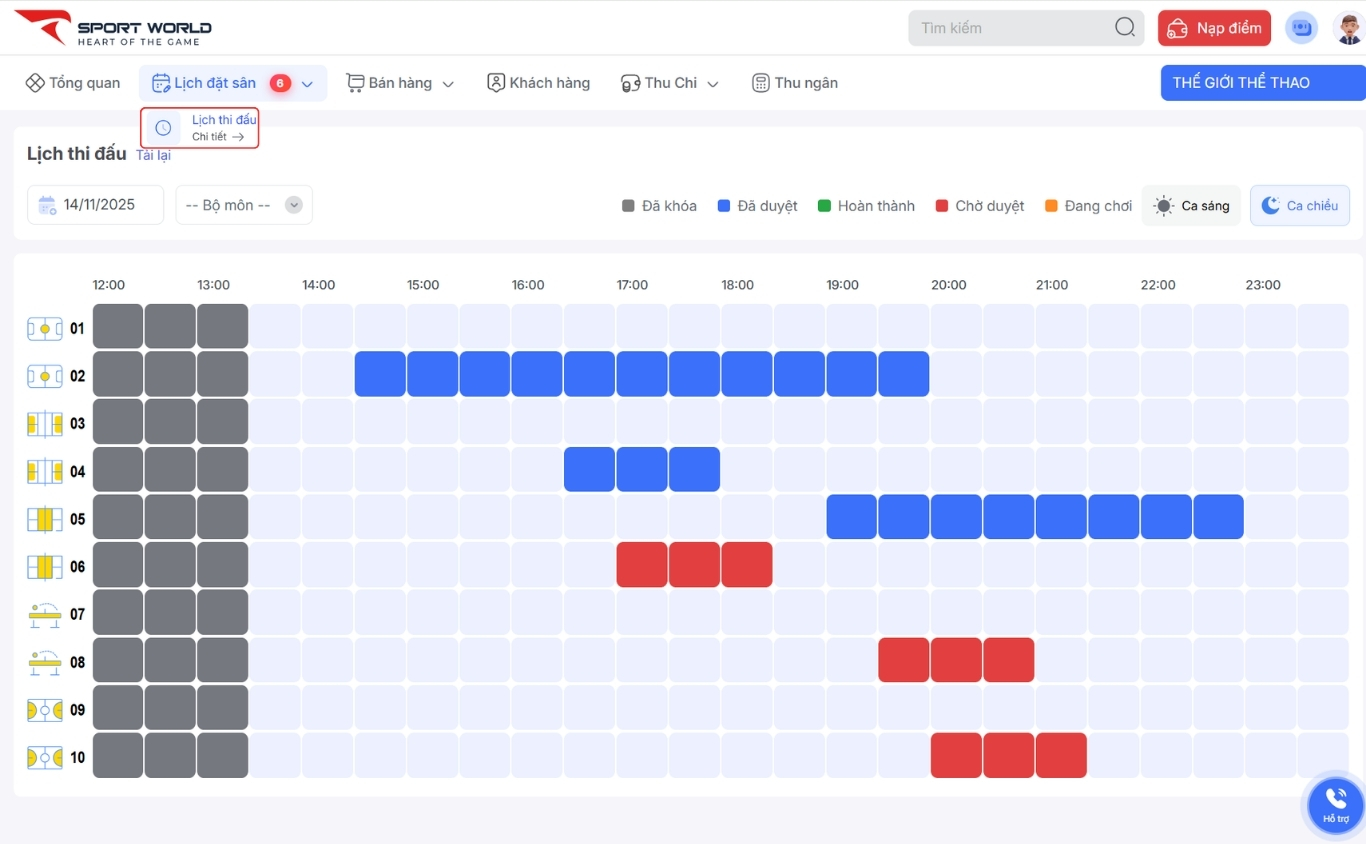 Màn hình "Lịch thi đấu" là nơi trực quan để xem tất cả các khung giờ đặt sân trong ngày. Nhân viên và chủ sân chỉ cần nhìn qua là biết khung giờ nào trống - khung giờ nào đang chơi - khung giờ nào chờ duyệt - khung giờ nào đã khóa.