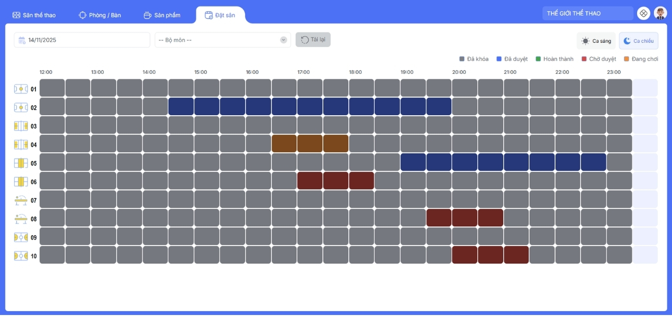 - Sân có thể chứa nhiều khung giờ trong ngày (tùy môn)