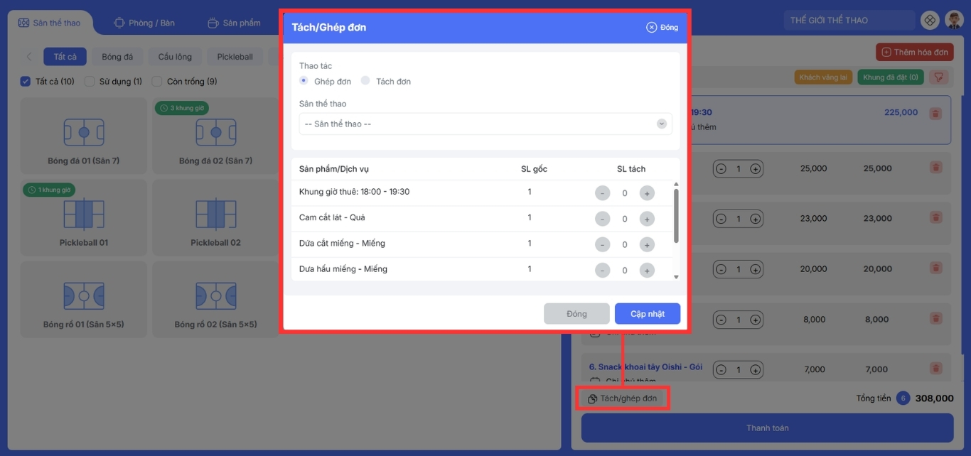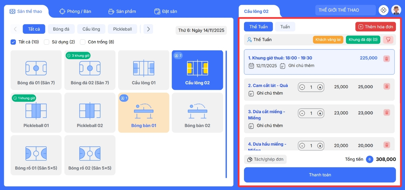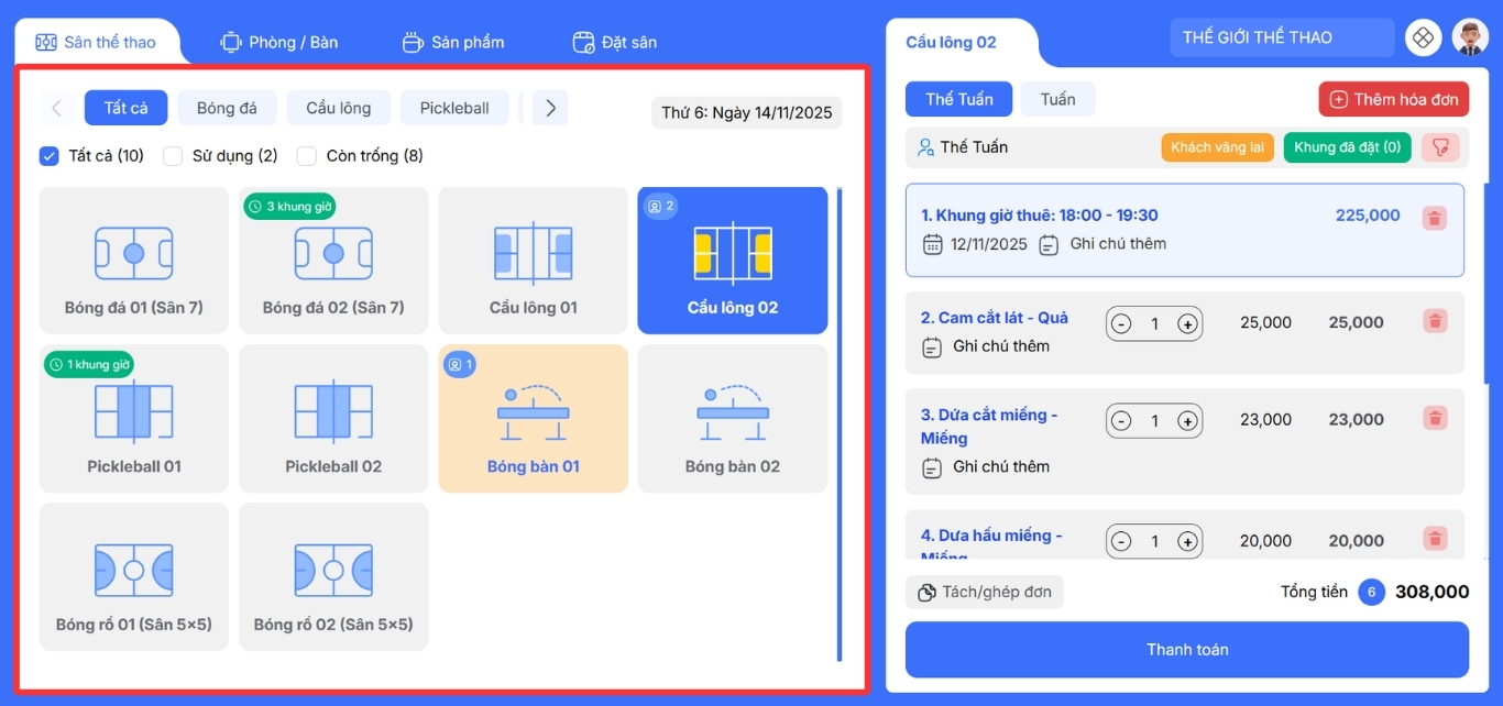 Màn hình này được thiết kế để nhân viên đặt sân nhanh, xử lý hóa đơn sân - thêm món - thu tiền - tách/ gộp đơn nhanh nhất, đồng thời giúp chủ sân kiểm soát toàn bộ quá trình.