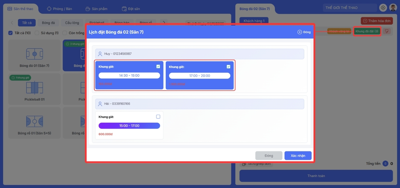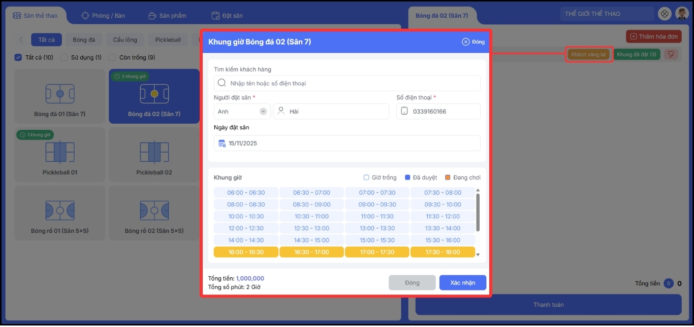 | Số khung giờ đang thuê | 3 khung giờ | Số khung giờ đã được đặt trên sân trong ngày Chưa xác nhận thông tin khách đặt |