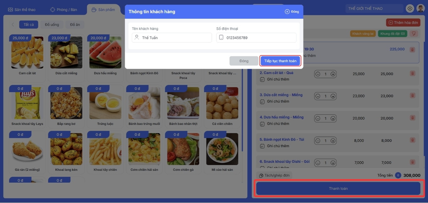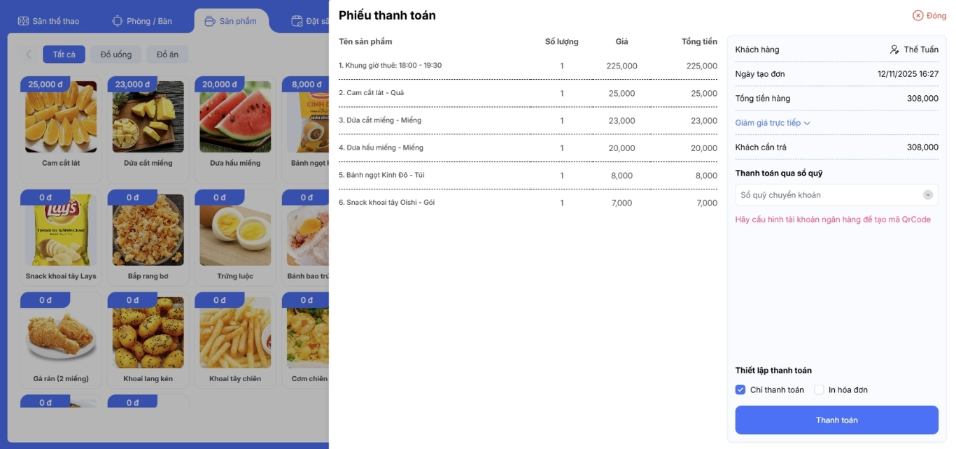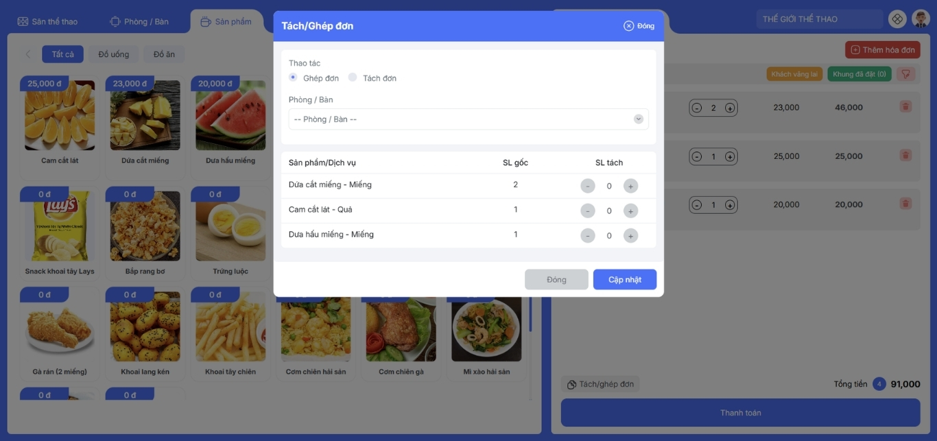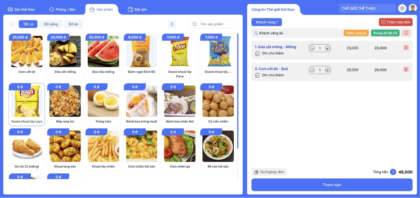 Màn này giúp chủ sân và thu ngân bán đồ ăn - nước uống - dịch vụ tại chỗ, tách/ghép đơn, thêm khách, quản lý số bàn và xử lý thanh toán nhanh chóng.