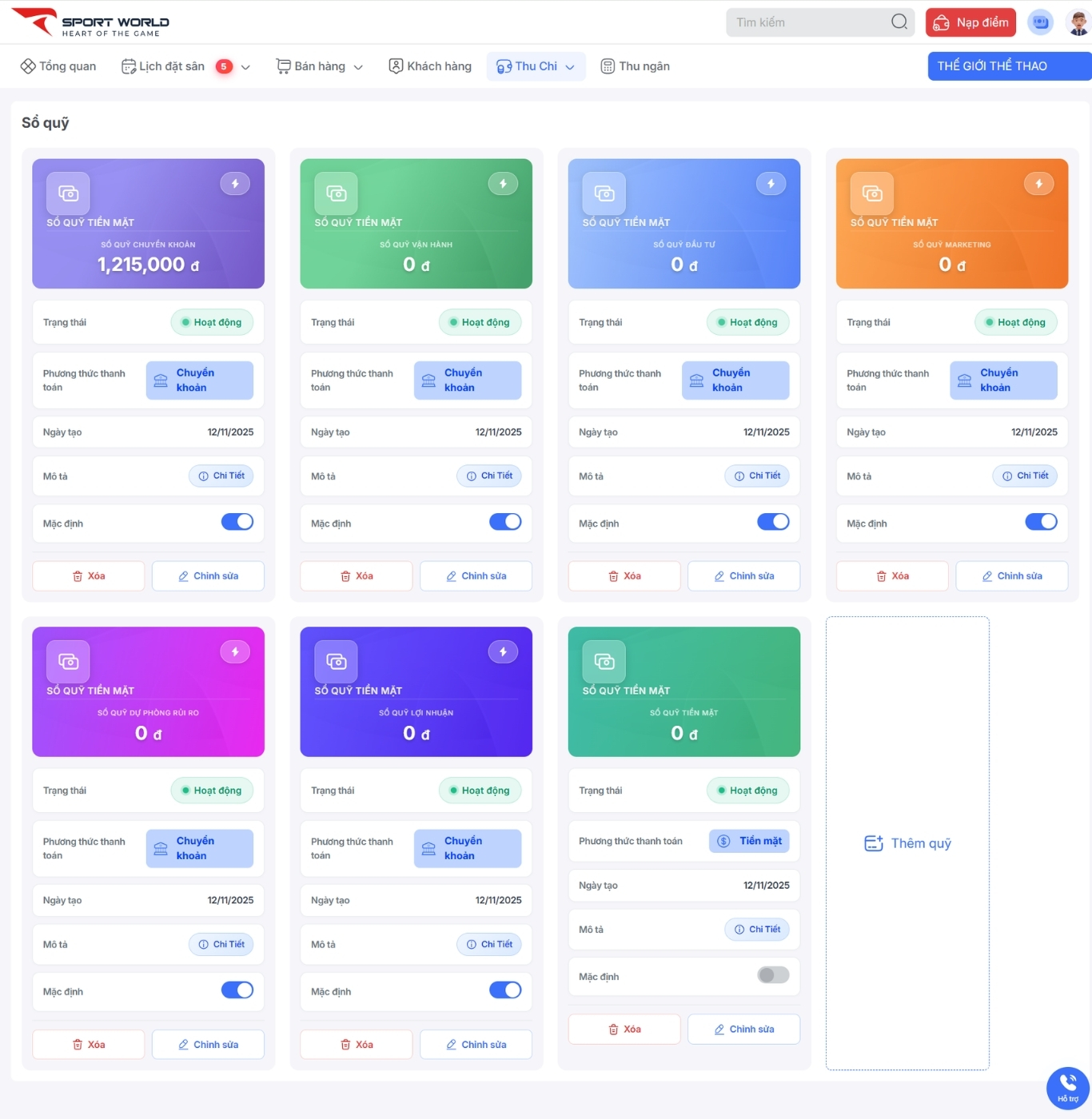 Màn hình Sổ Quỹ giúp chủ sân theo dõi và quản lý toàn bộ nguồn tiền của sân theo từng “quỹ” riêng biệt.